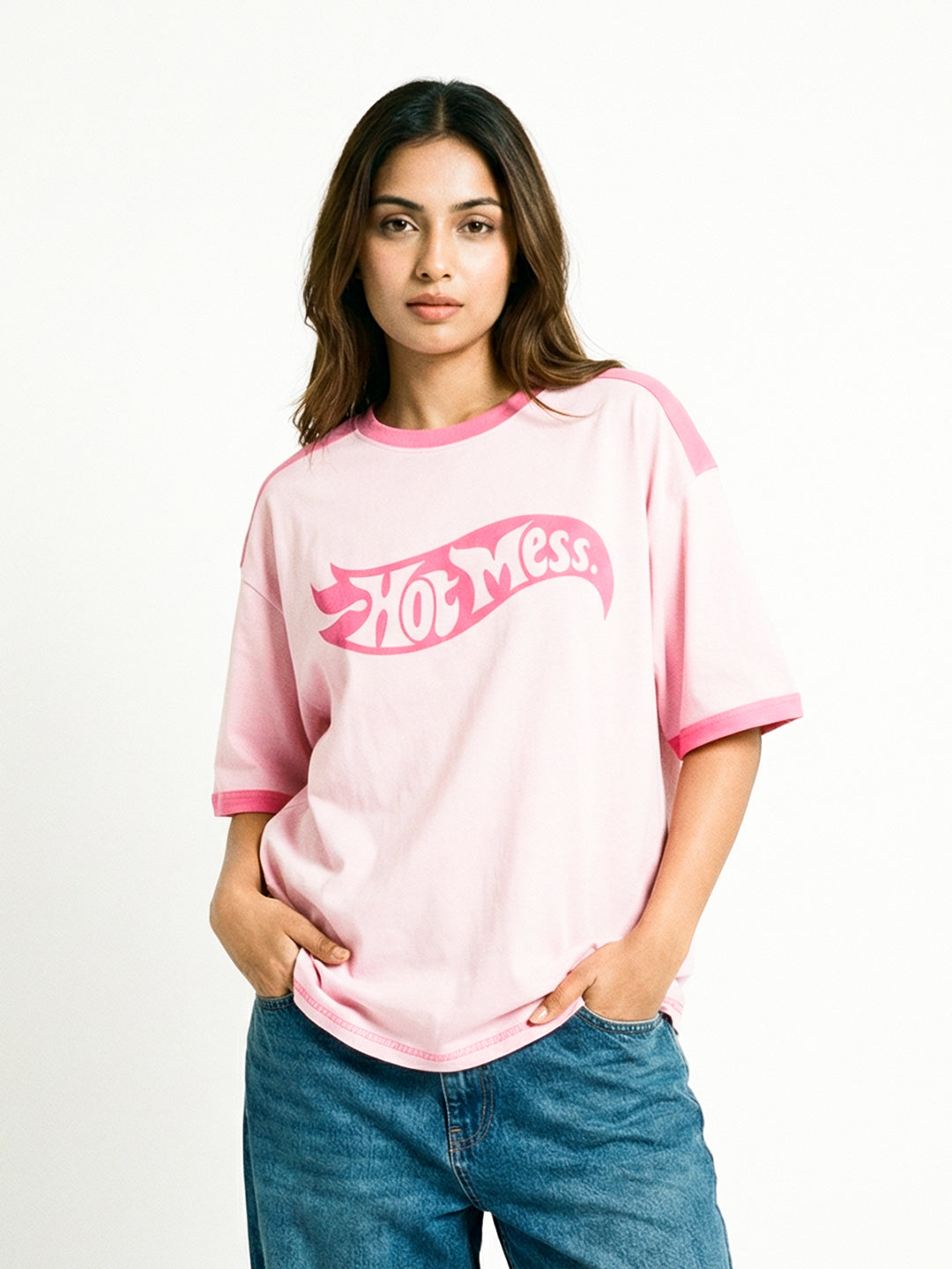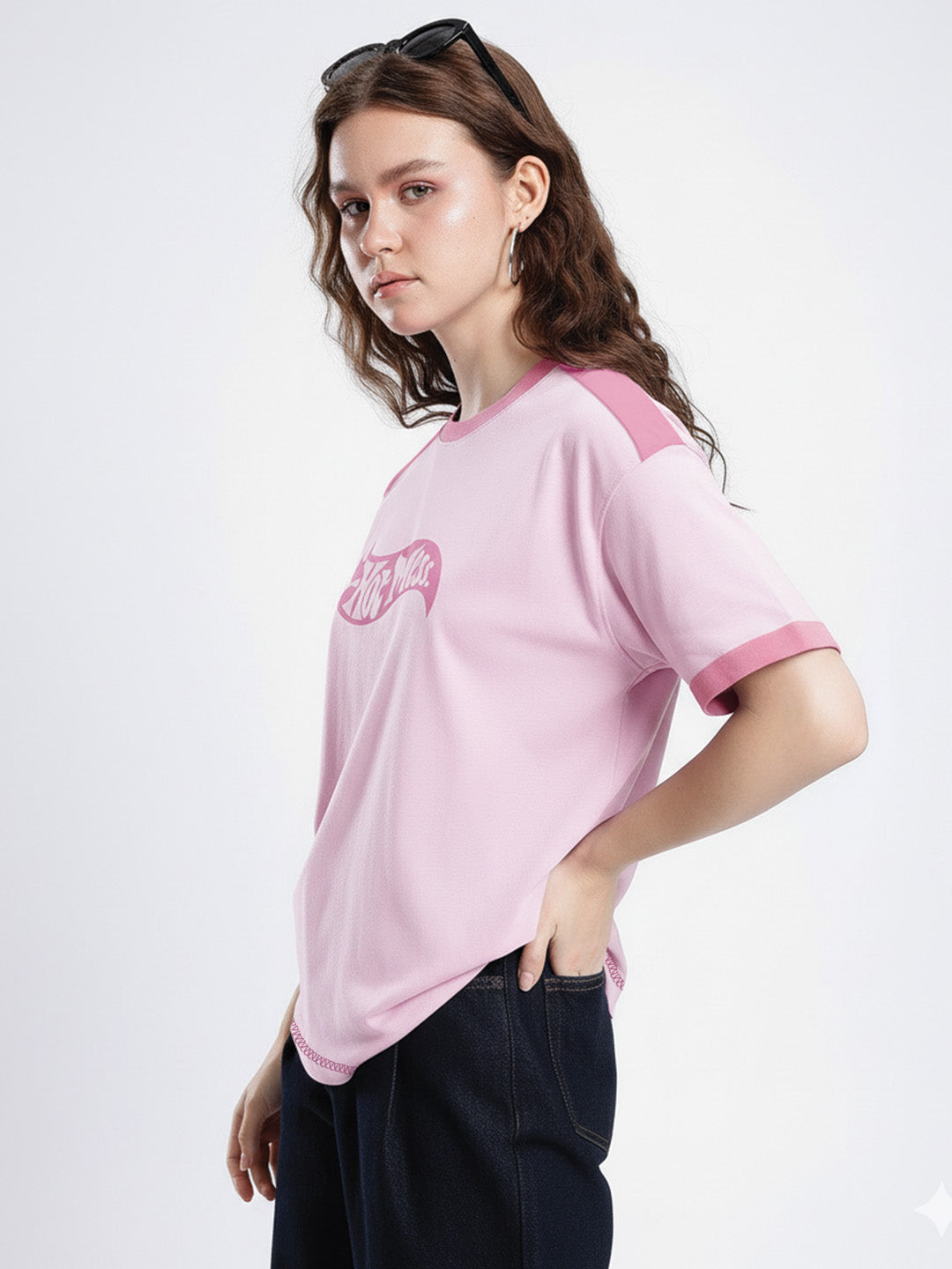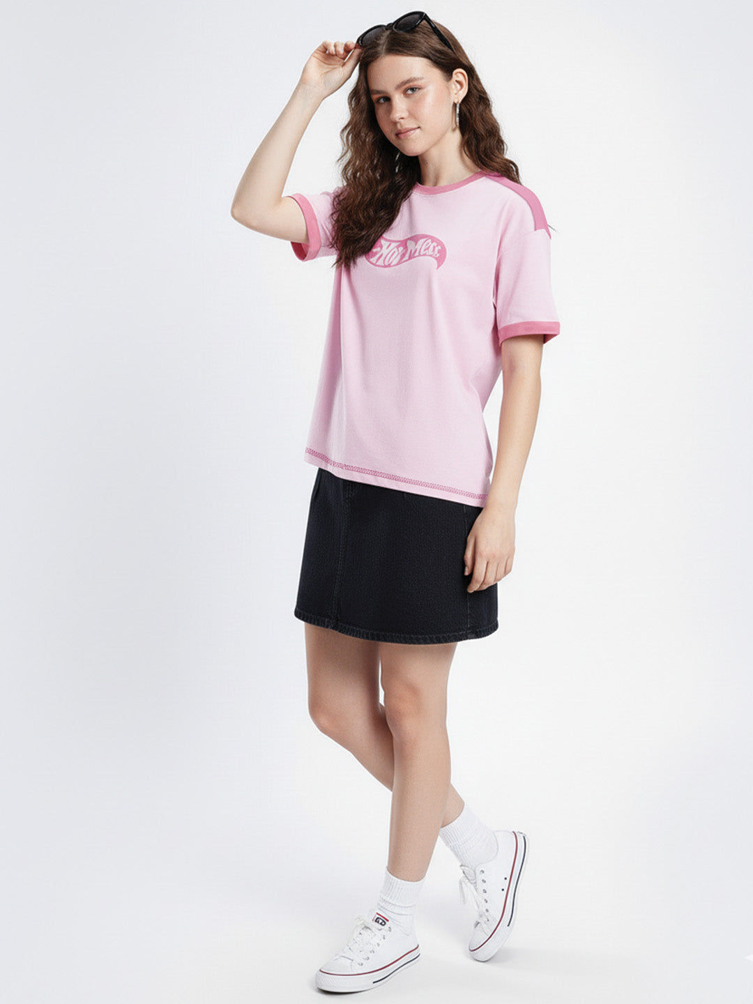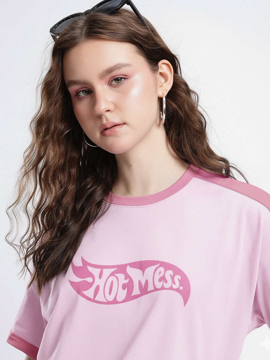Hot Mess Women Oversized T-Shirt - Pink - Sleeve Stripes